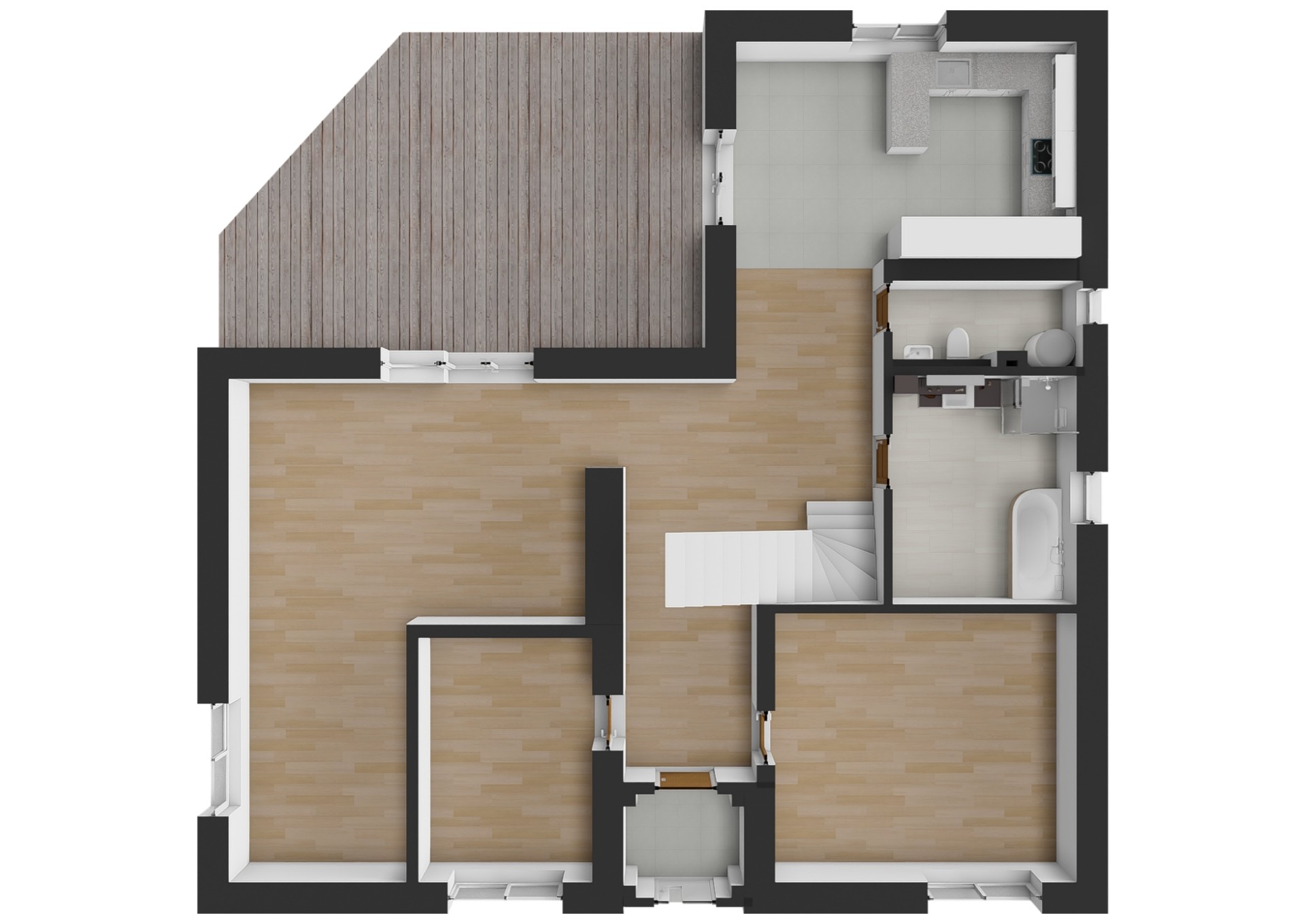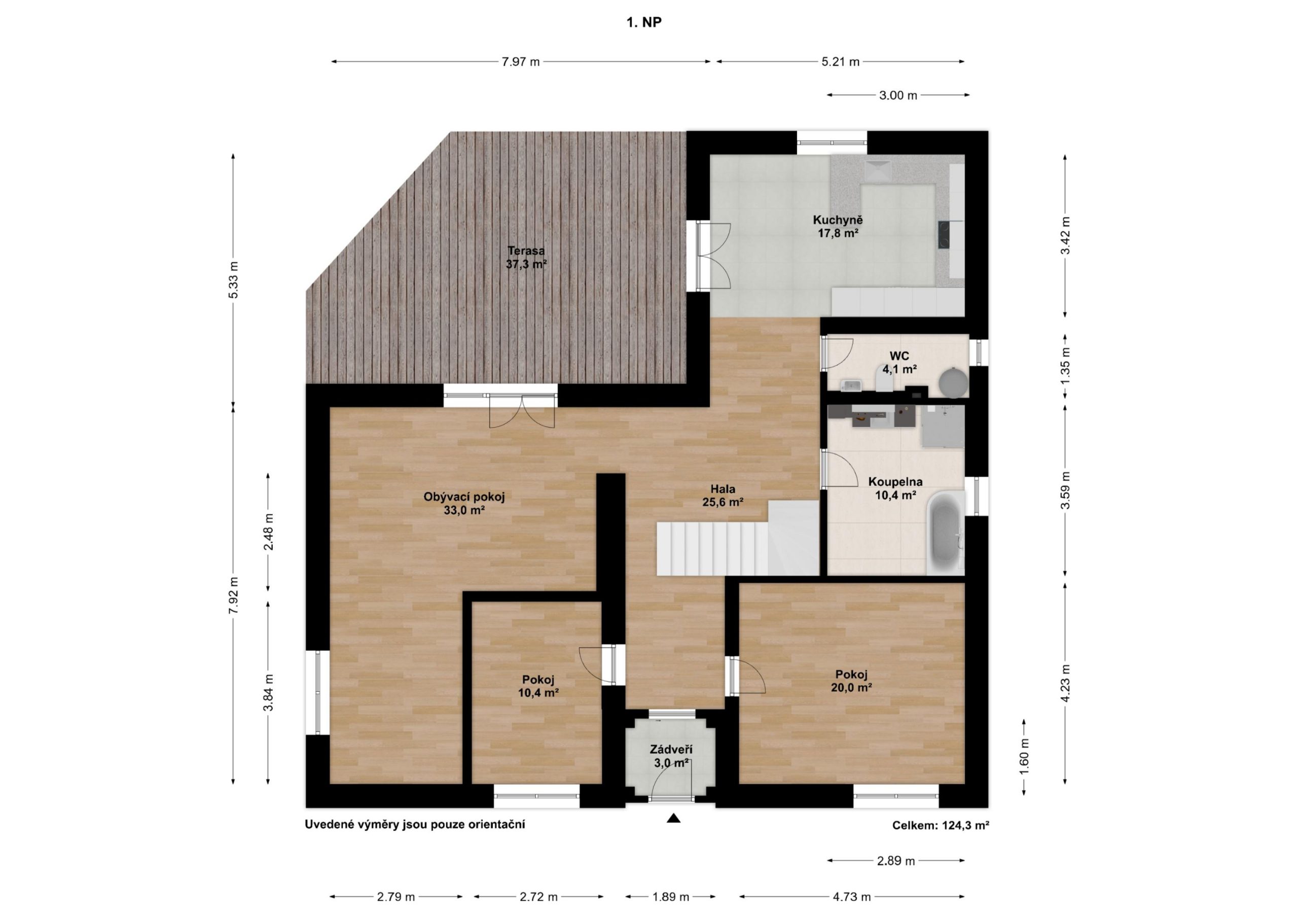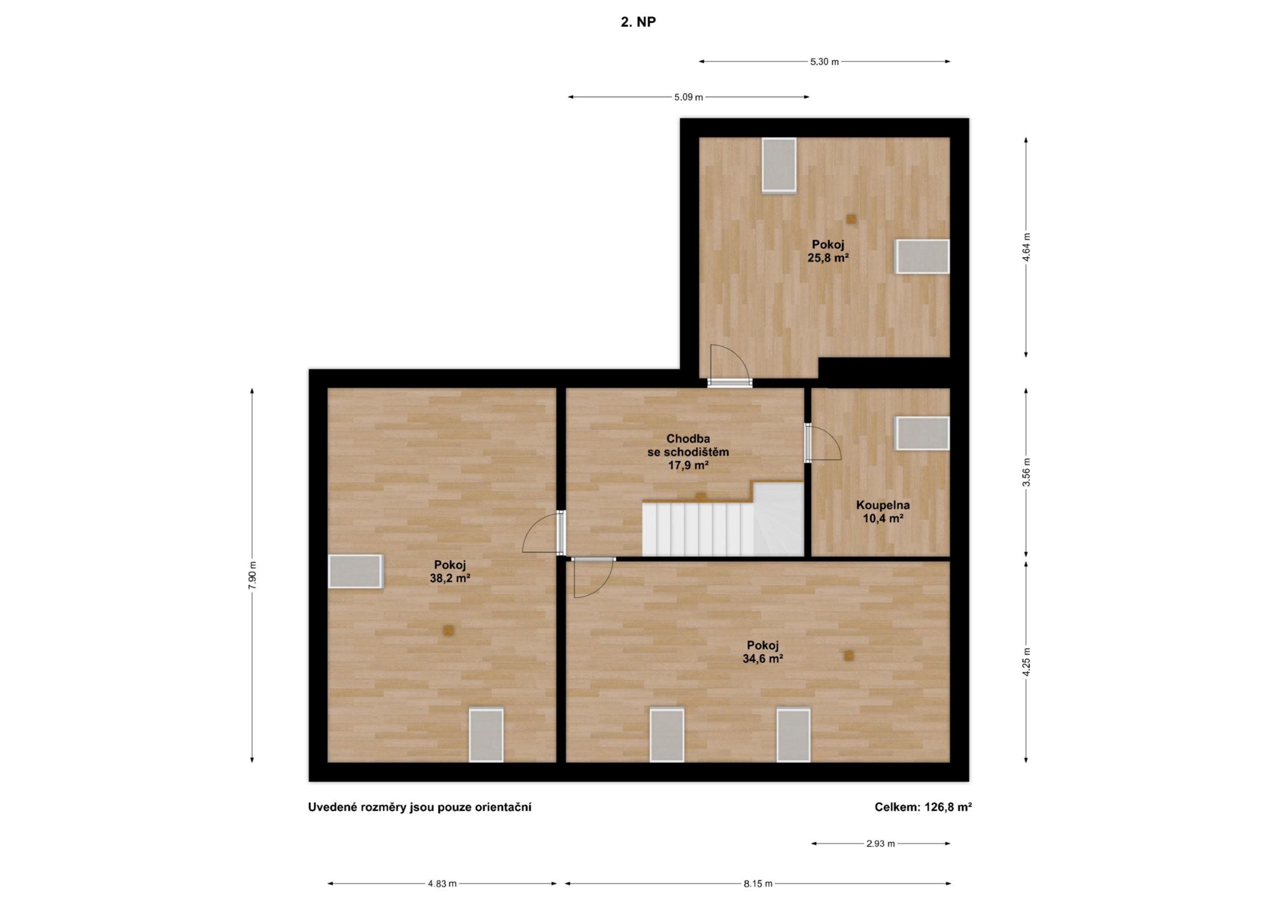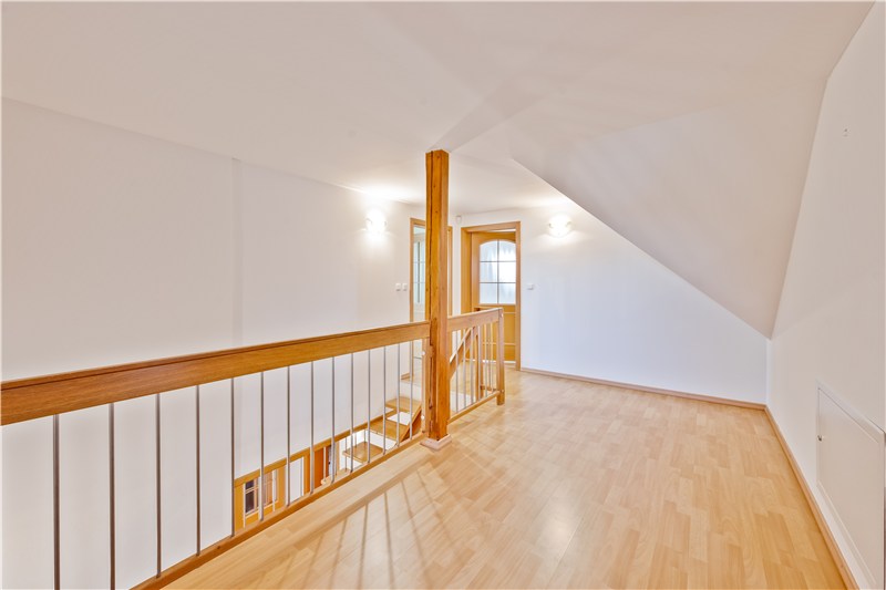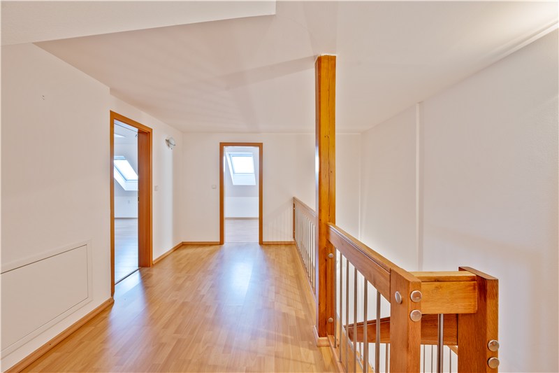 V obytném podkroví se nachází chodba se vstupy do dalších tří pokojů a koupelny s WC. Koupelna je zatím nedokončená, velkou výhodou je, že si ji každý může zařídit dle vlastních představ. Výměry jednotlivých místností a jejich dispozice jsou uvedeny ve fotogalerii.
