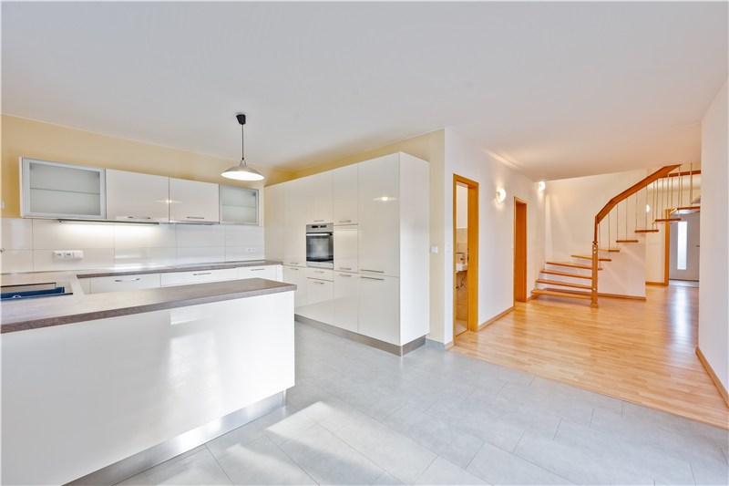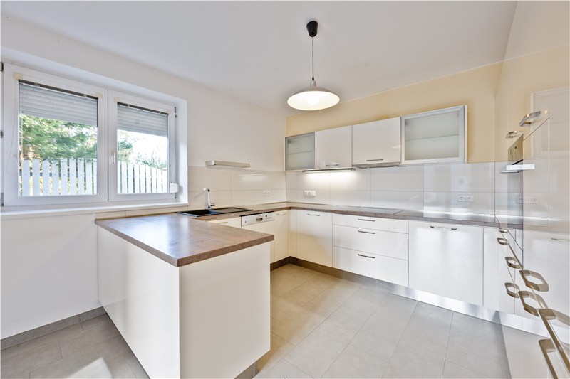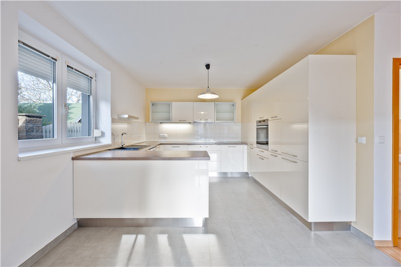 Dům je vybavený moderní kuchyňskou linkou s praktickým ostrůvkem a vestavenými značkovými spotřebiči (lednička s mrazákem, myčka, el. varná deska, digestoř, el. trouba). Ve všech obytných místnostech je nainstalovaná plovoucí podlaha, v koupelně, WC, technické místnosti a v kuchyni je položena dlažba.
