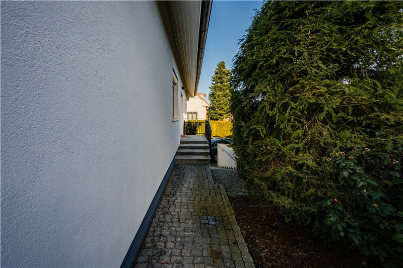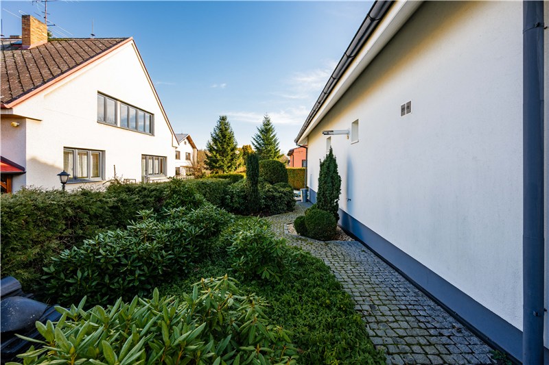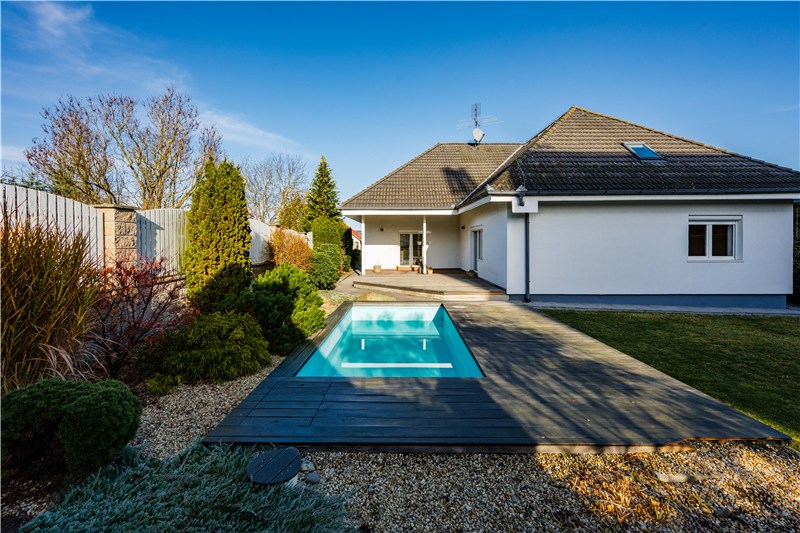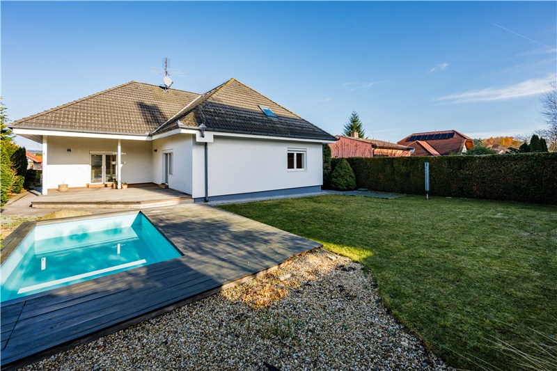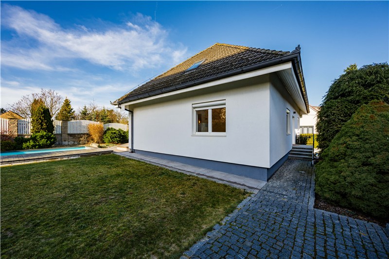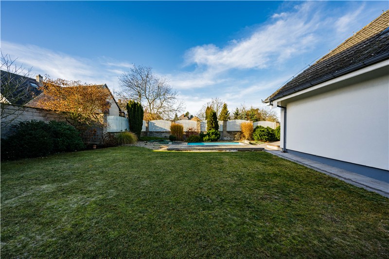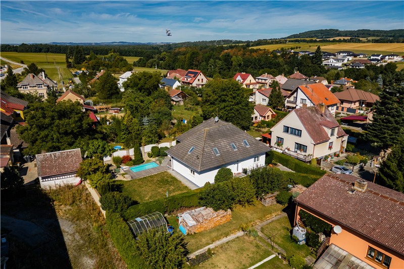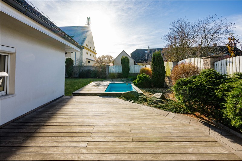 Součástí domu je udržovaná, plně oplocená zahrada, která nabízí ideální kombinaci soukromí, klidu a prostoru pro rodinný život. Dominantou je zapuštěný bazén s dřevěnou terasou, ideální pro letní dny i dětské radovánky.