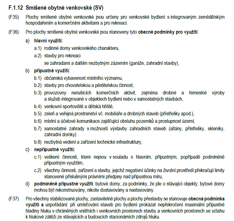 a) hlavní využití: rodinné domy venkovského charakteru, stavby pro rekreaci se zahradami a dalším nezbytným zázemím (garáže, zahradní stavby).